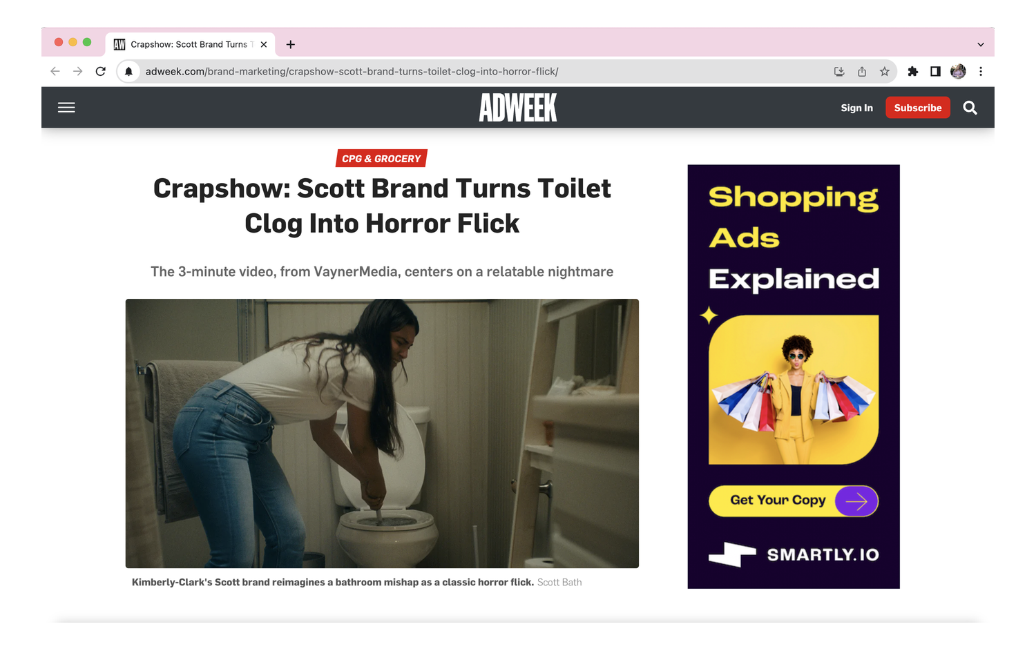 The first rule of a horror movie, never investigate the creepy sound. First rule of pooping, never do it without Scott Toilet Paper. We brought Scott’s biggest RTB (clog-free technology) and one of the world’s biggest fears (clogging the toilet) together to convince people to never poop without Scott again. And with over 54 million impressions, we think people got the message.